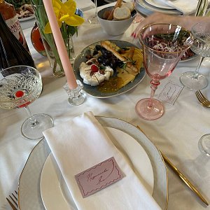 Свадьба была в стиле 60-х, 70-х. За референсы я брала образы Одри Хепбёрн и стилистику фильмов, в которых она снималась. У нас была классическая и элегантная свадьба. Было очень много красивых весенних цветов. Нам очень повезло, что в этом году так тепло в апреле, хотя прямо перед тем, как мы приехали к гостям, пошел ливень. Но, если не ошибаюсь, это что-то хорошее значит, когда в день свадьбы идёт дождик.